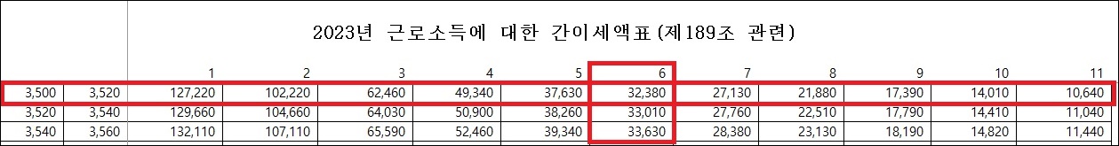 개정 전 근로소득 간이세액표에 따른 소득세를 살펴보면 우선 부양가족 수는 본인 + 배우자 + 8세 이상 20세 이하 자녀 2명인 총 4명에 8세 이상 20세 이하 자녀 2명을 한 번 더 더한 6명이 됩니다. 근로소득 간이세액표에서 월 급여 350만원 행과 부양가족수 6명인 열이 교차하는 지점의 금액이 32,380원이 해당월에 징수될 소득세가 됩니다.
