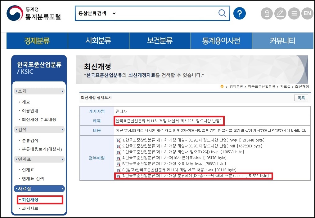 2. 자료실 → 최신개정 → 한국표준산업분류 제11차 개정 해설서 게시 → 제11차 개정 분류체계 첨부파일 다운로드
