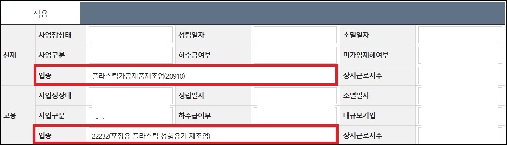하단의 고용보험, 산재보험 업종코드를 확인해 줍니다. 위의 예시를 보시면 고용보험의 경우 포장용 플라스틱 성형용기 제조업으로 업종코드 22232로 등록되어 있고 산재보험의 경우 플라스틱 가공 제품 제조업으로 업종코드가 20910으로 등록되어 있습니다.