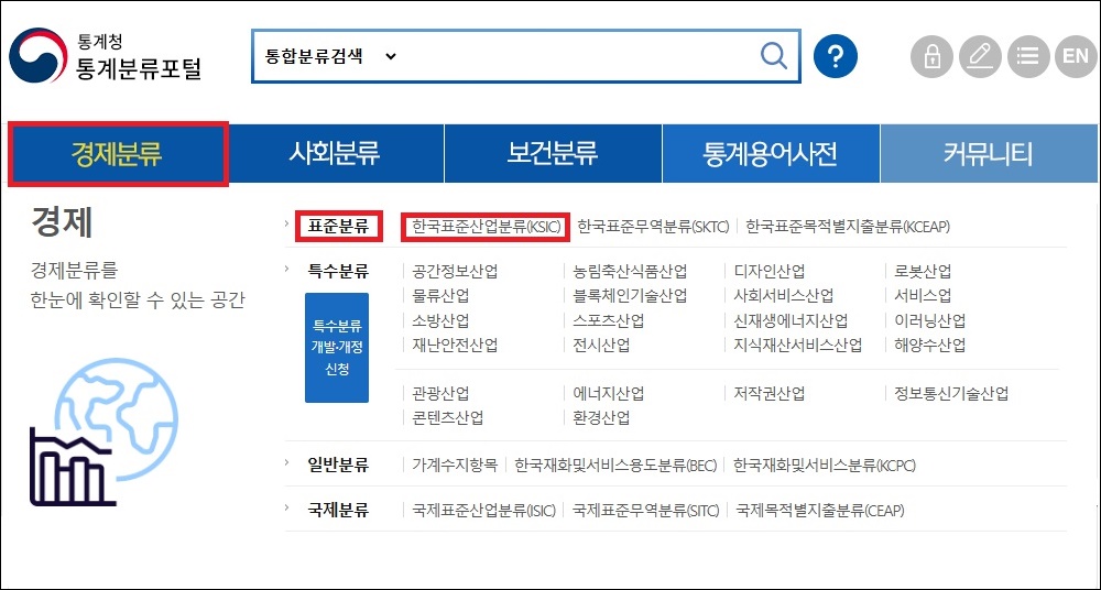 1. 통계분류포털(http://kssc.kostat.go.kr) → 경제분류 → 표준분류 → 한국표준산업분류