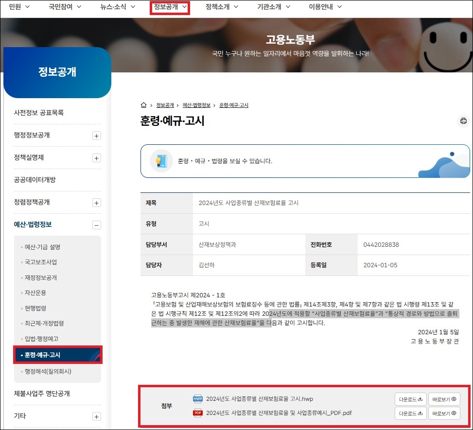 1. 고용노동부(https://www.moel.go.kr) → 정보공개 → 예산·법령정보 · 훈령 ·예규 ·고시 → 2024년도 사업종류별 산재보험료율 고시 → 첨부파일 다운로드
