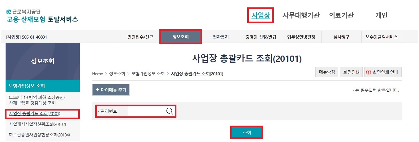 1. 고용산재보험 토탈서비스(https://total.comwel.or.kr) → 사업장 로그인 → 사업장 → 사업장 총괄카드 조회 → 관리번호 조회