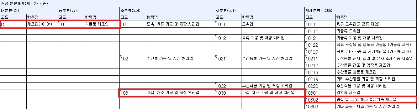 예를 들어 채소 절입식품 제조 사업을 하는 사업장이라면 제조업 - 식료품 제조업 - 과실, 채소 가공 및 저장 처리업 중 과실 및 그 외 채소 절임식품 제조업에 해당하므로 고용보험 사업장 업종코드는 10302가 됩니다. 고용보험 업종코드 엑셀파일은 아래의 첨부파일에서도 확인하실 수 있습니다.