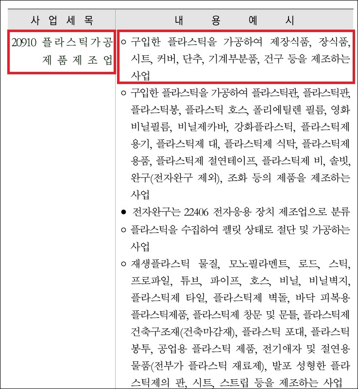 예를 들어 산업의 종류가 플라스틱을 가공하여 제장식품, 장식품, 시트, 커버, 단추 등을 제조하는 사업이라면 플라스틱가공 제품 제조업에 해당하여 산재보험 업종코드는 20910이 됩니다. 산재보험 업종코드 파일은 아래의 첨부파일에서도 확인 가능합니다.