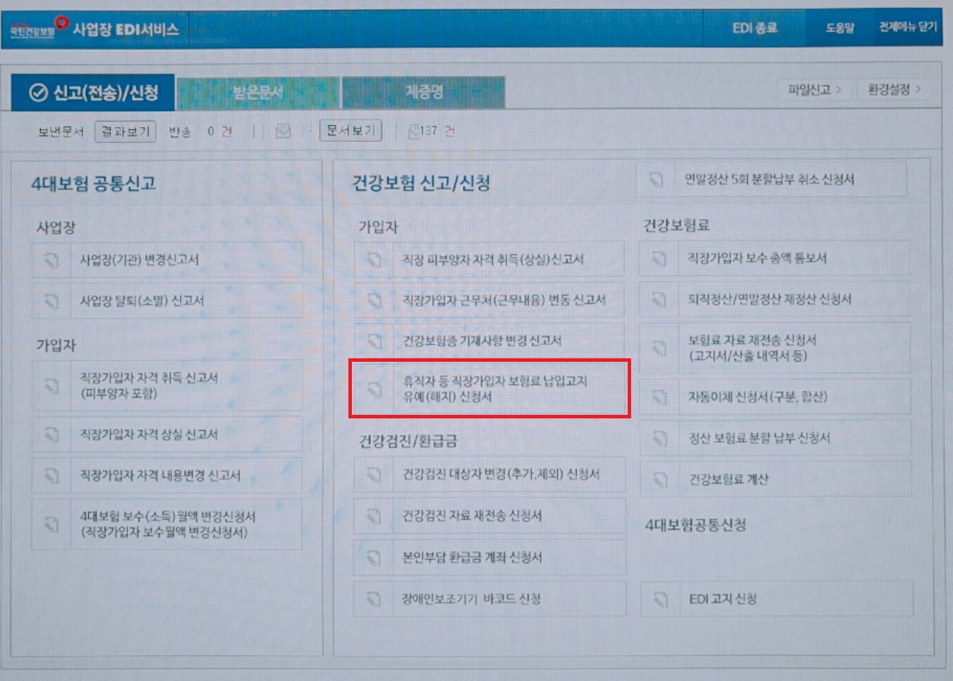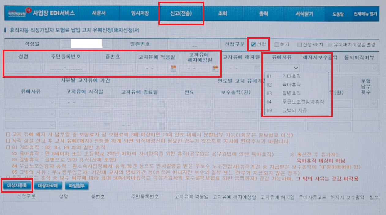 ◆ 건강보험EDI(edi.nhis.or.kr) > 사업장로그인 > 공인인증서로그인 > 휴직자 등 직장가입자 보험료 납입고지 유예(해지)신청서