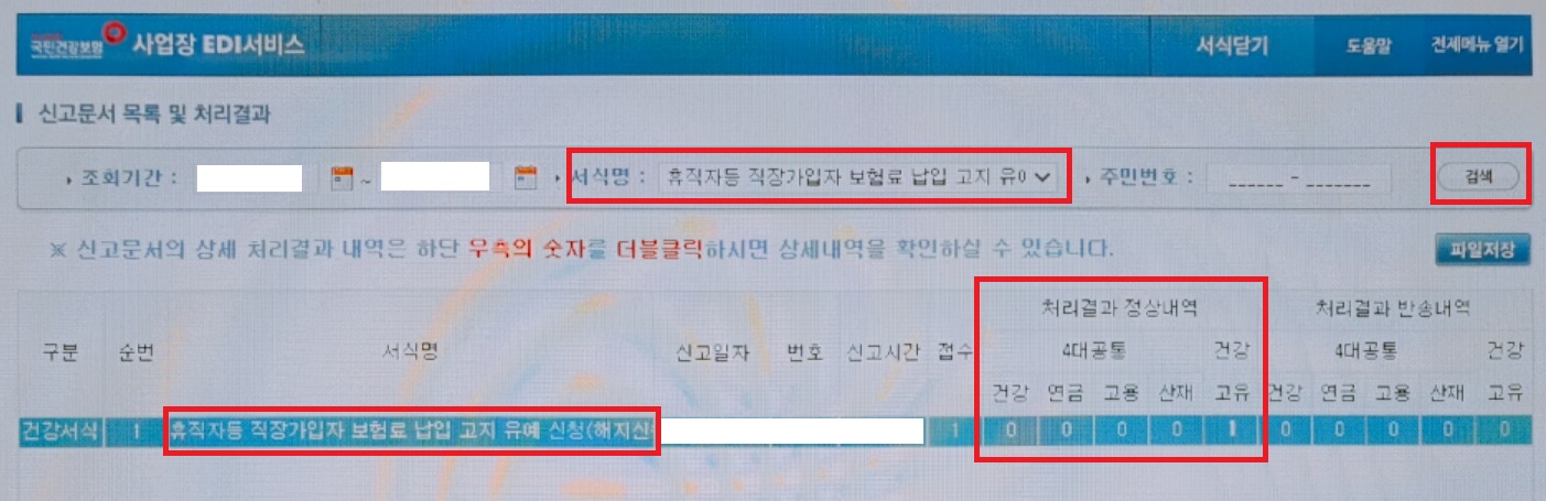 서식명을 휴직자등 직장가입자 보험료 납입 고지 유예 신청(해지신청)으로 검색하여 처리가 되었는데 처리결과 정상내역을 확인합니다.