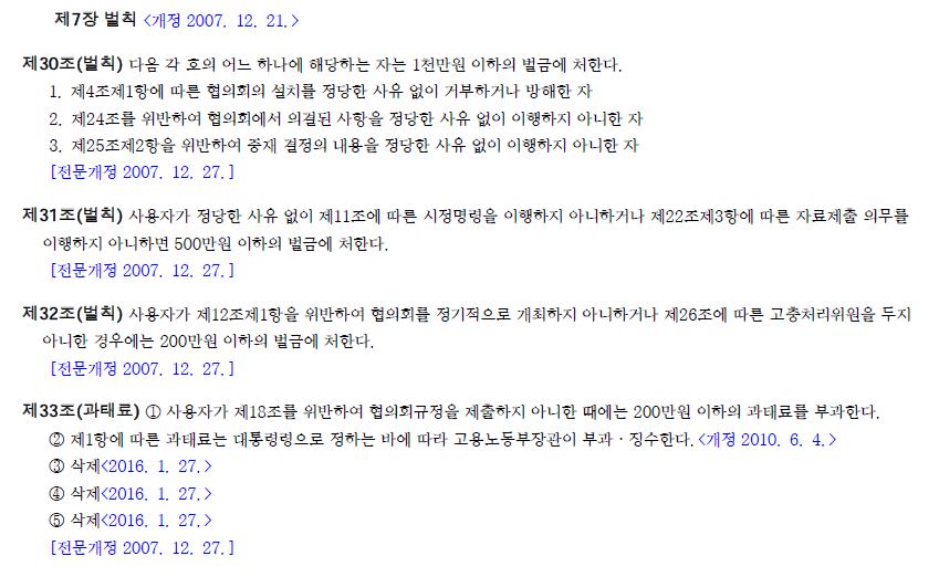 노사협의회의 설치를 정당한 사유 없이 거부하거나 방해한 자는 1천만원 이하의 벌금이 부과되며, 노사협의회를 정기적으로 개최하지 않은 경우에도 200만원 이하의 벌금이 부과됩니다. 협의회규정을 제출하지 않아도 200만원 이하의 과태료가 부과되니 30인 이상 사업장이거나 곧 30인 이상이 될 사업장이라면 해당 내용 잘 참고하셔서 벌금이나 과태료 부과되지 않도록 해주셔요!~