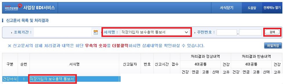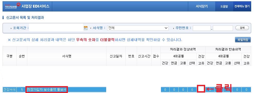 7. 직장가입자 보수총액 통보서 처리내역 선택(처리결과 정상내역의 숫자 클릭)