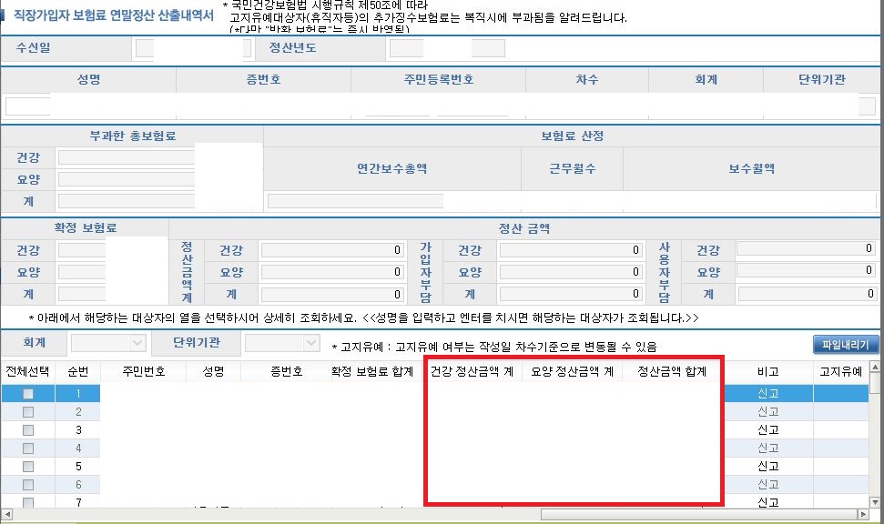 8. 근로자별 건강보험료 및 장기요양보험료 정산금액 확인