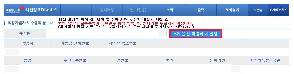 3. 5회 분할 적용제외 신청 클릭 → 확인 클릭