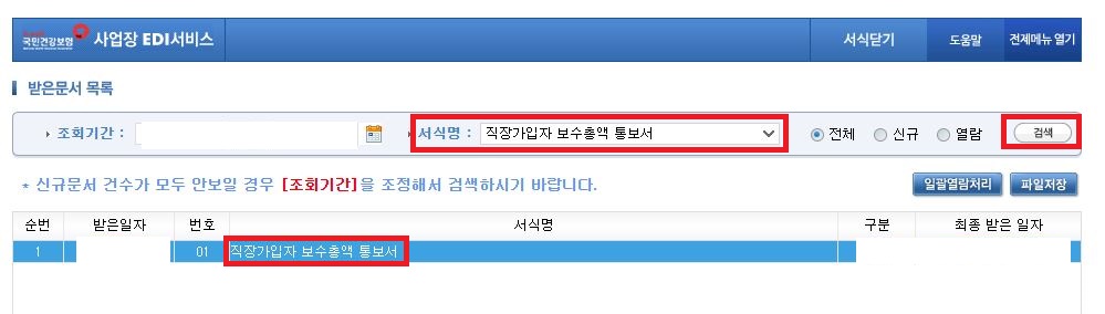 1. 국민건강보험 EDI 접속(https://edi.nhis.or.kr) 및 사업장 로그인 → 받은문서 → 전체보기 클릭