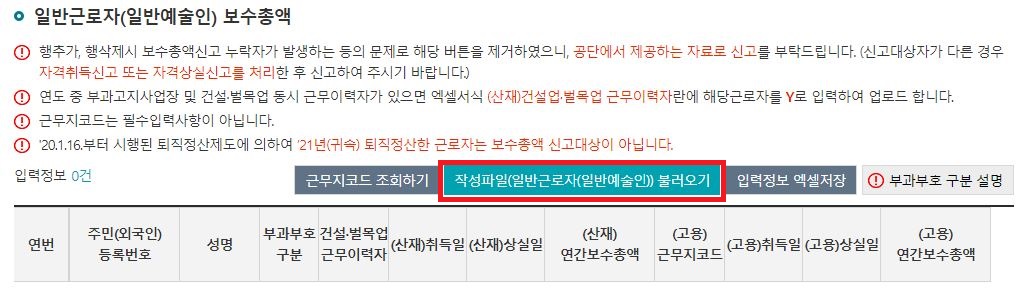 4. 일반근로자 보수총액 화면에서 작성파일 불러오기 클릭 → 저장된 엑셀파일 업로드