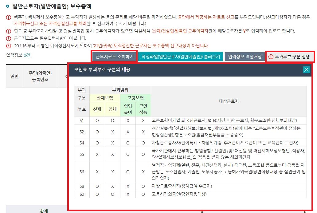 (산재, 임채, 실업급여, 고안직능 모두 부과되는 일반근로자의 경우 부과부호를 넣지 않으시면 됩니다.)