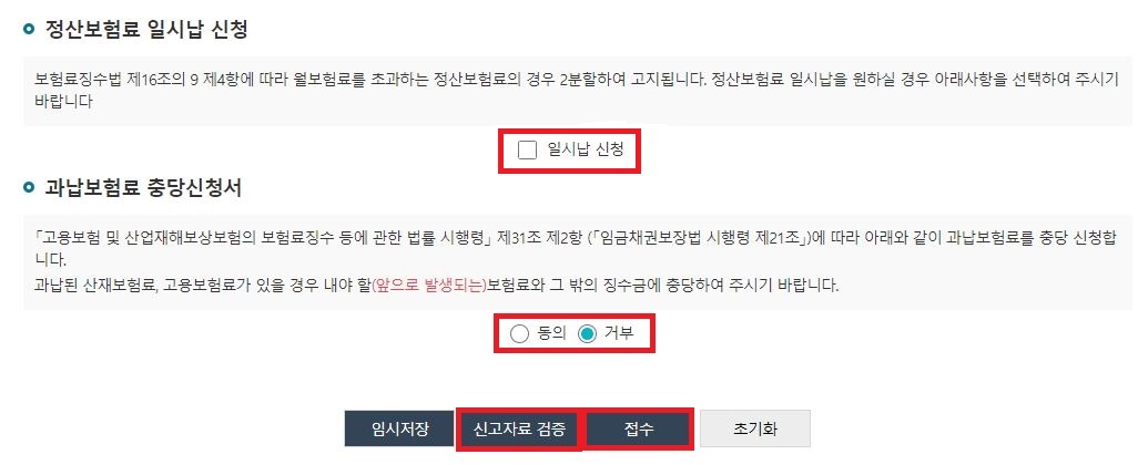 5. 정산보험료 일시납 신청 시 일시납 신청 클릭 → 과납보험료 충당신청 동의/거부여부 클릭 → 신고자료 검증 → 접수