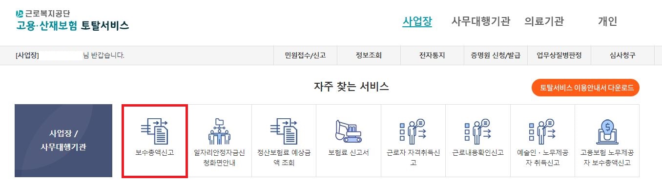 1. 근로복지공단 고용산재보험 토탈서비스(https://total.comwel.or.kr) 접속 → 사업장로그인 → 보수총액신고 클릭