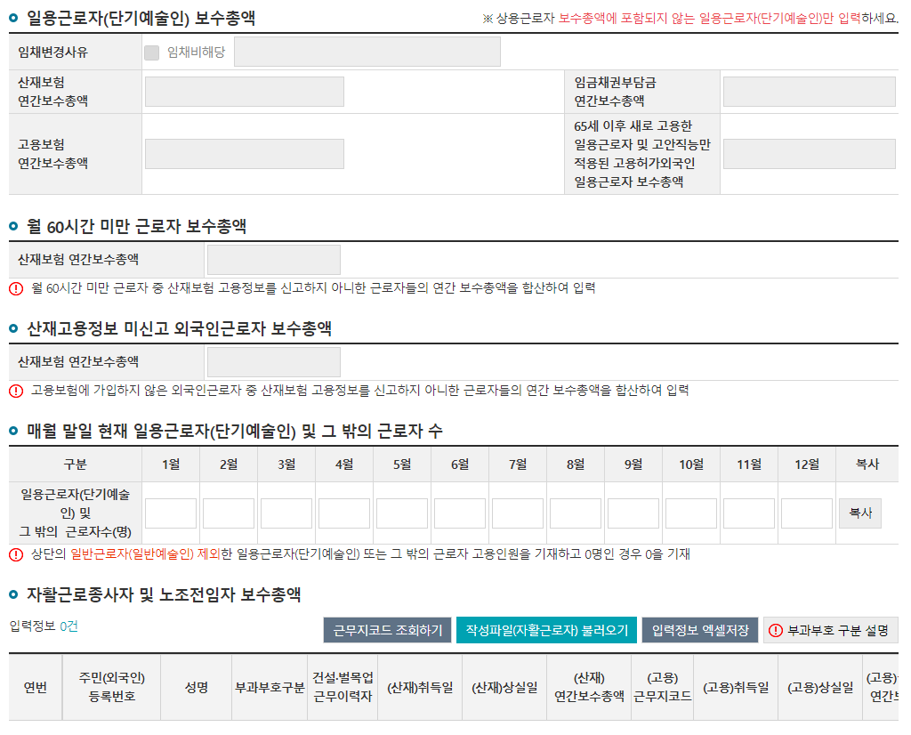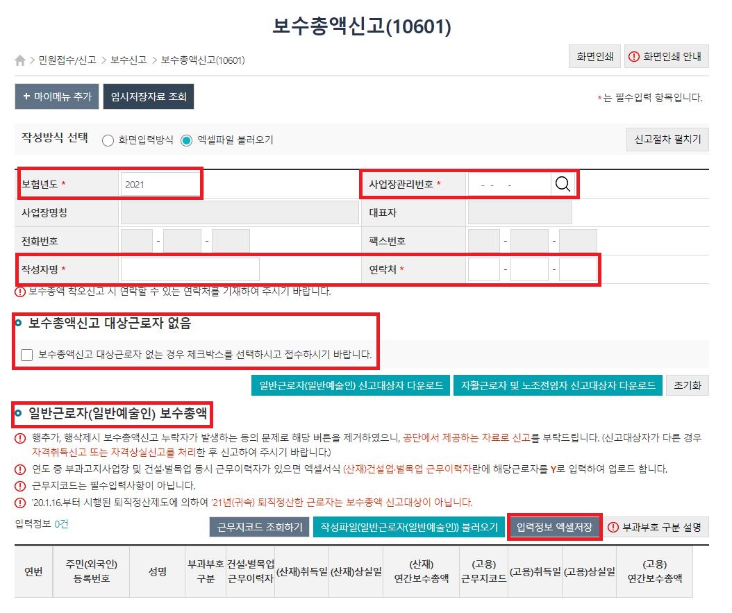 2. 보험년도확인 및 사업장관리번호 조회 → 작성자명, 연락처 기재 → 보수총액신고 대상근로자가 없는 경우 보수총액신고 대상근로자 없음 선택 / 보수총액신고 대상근로자가 있는 경우 일반근로자 보수총액신고 입력정보 → 입력정보 엑셀저장 클릭하여 엑셀파일 생성