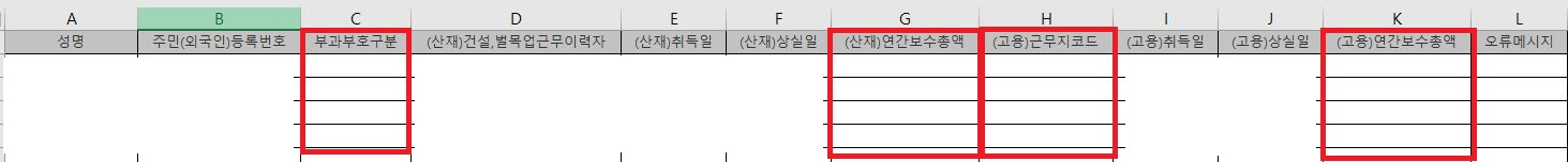 3. 생성된 엑셀파일에서 근로자별 연간보수총액 및 부과부호구분, 근무지코드 입력 후 저장