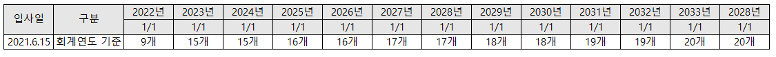 2. 2021.6.15 입사한 사원의 회계연도 기준 연차휴가 12년간 생성 현황