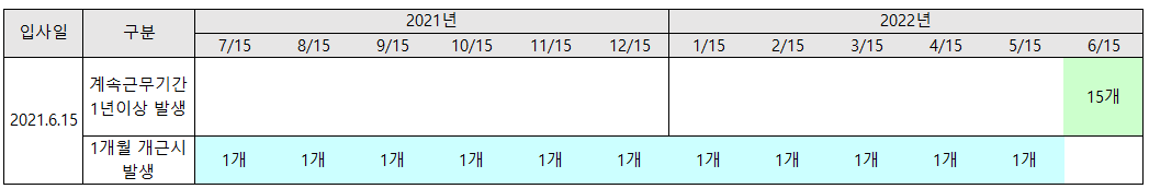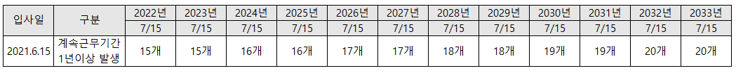 2. 2021.6.15 입사한 사원의 계속근무기간 1년이상 시 발생하는 연차휴가 12년간 생성 현황