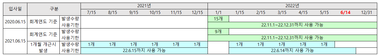 회계연도 기준으로 1/1에 부여하는 연차의 경우 사용기한이 1년이므로 그 해 말까지 사용 가능하고, 신규 입사자의 1개월 개근 시 1개씩 발생하는 연차는 입사일이 2021.06.15인 경우 입사일로부터 1년인 2022.06.14까지 사용이 가능합니다.