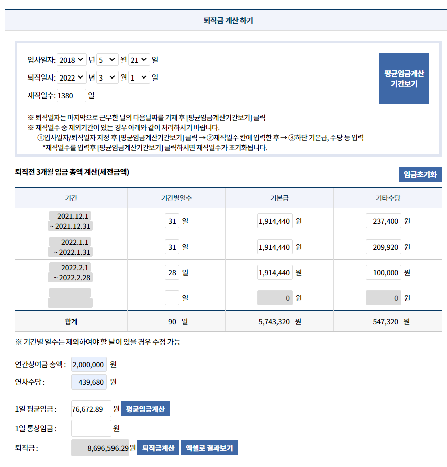 - 퇴직금 계산기: https://www.moel.go.kr/retirementpayCal.do