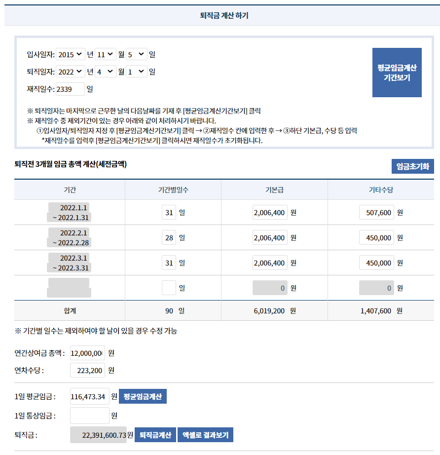 *이전 포스팅에서 말씀드렸던 대로 고용노동부 제공 퇴직금 계산기를 이용하면 퇴직금을 쉽게 계산할 수 있습니다. 동일한 결과가 나오죠?