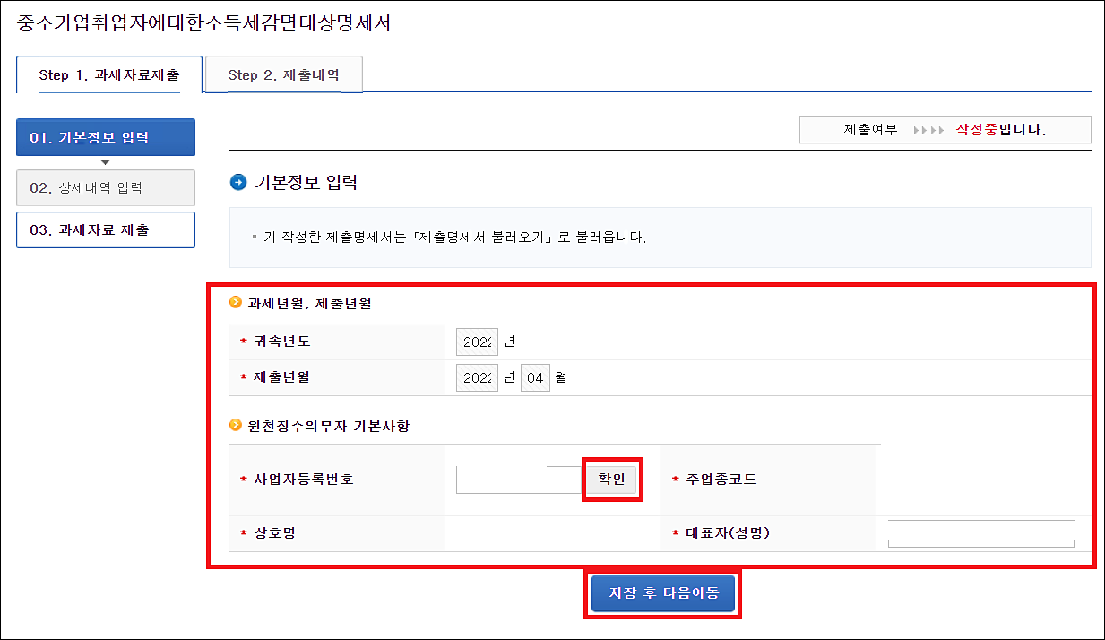 - 사업자등록번호 확인을 클릭하시면 주업종코드, 상호명, 대표자 성명이 자동으로 기재됩니다. 기재사항을 확인하신 후 이상 없는 경우 저장 후 다음이동을 클릭해주세요.