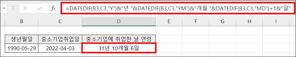 - 중소기업에 취업한 날 연령은 엑셀에서 아래와 같은 DATEDIF 함수 식을 이용하여 쉽게 계산할 수 있습니다. 병역 근무를 한 경우 중소기업에 취업한 날 연령에서 병역 근무기간을 차감한 연령을 7번에 써줍니다. 시작일에는 소득세 감면을 받은 최초 취업일을 적어줍니다. 보통은 해당 중소기업 취업일 이지만 이전에 근무하였던 중소기업에서 소득세 감면을 받은 경우 그 기업에서 최초로 감면을 받은 날짜(이전 중소기업 취업일)를 기재해 줍니다.