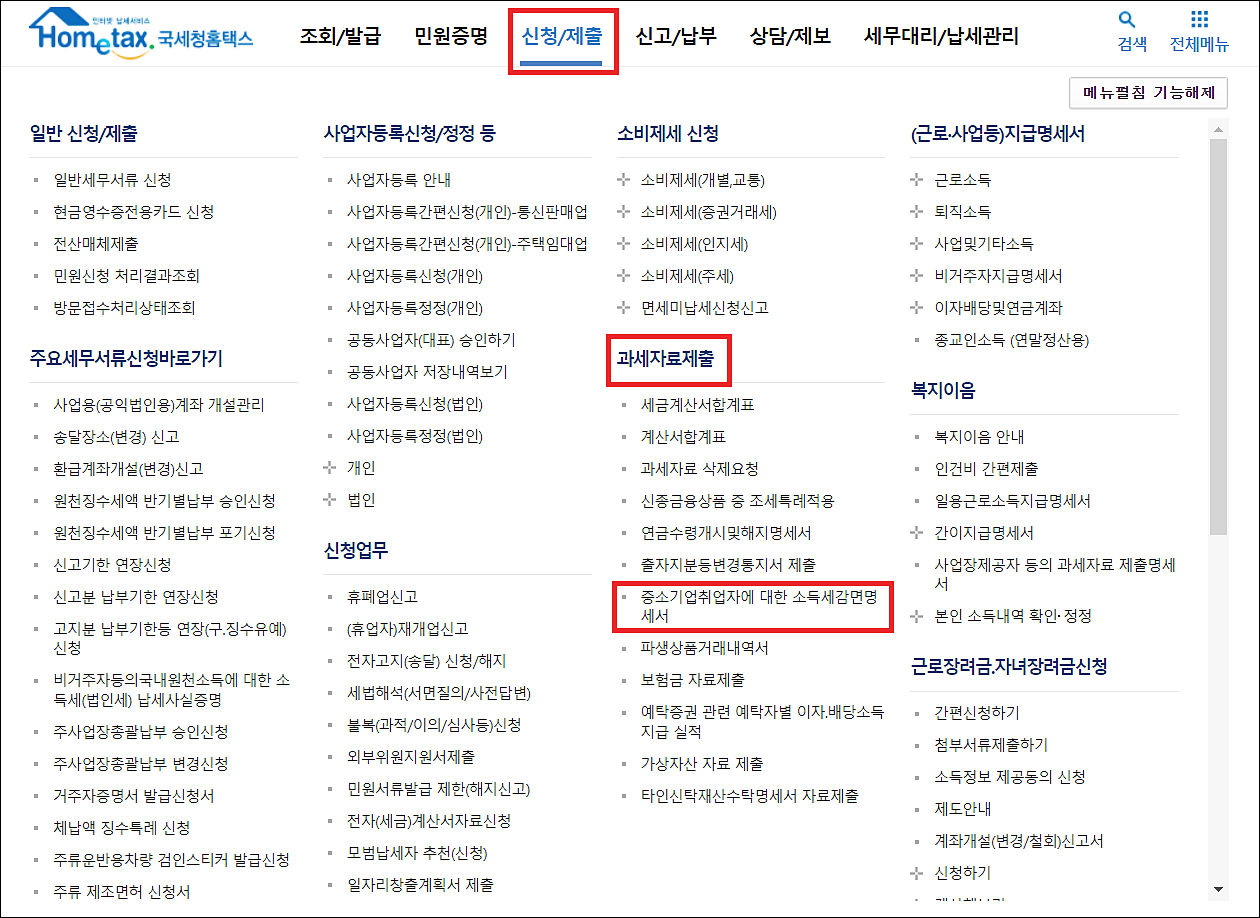 1. 국세청홈택스(https://www.hometax.go.kr) → 기업 로그인 → 신청/제출 → 과세자료제출 → 중소기업취업자에 대한 소득세감면명세서