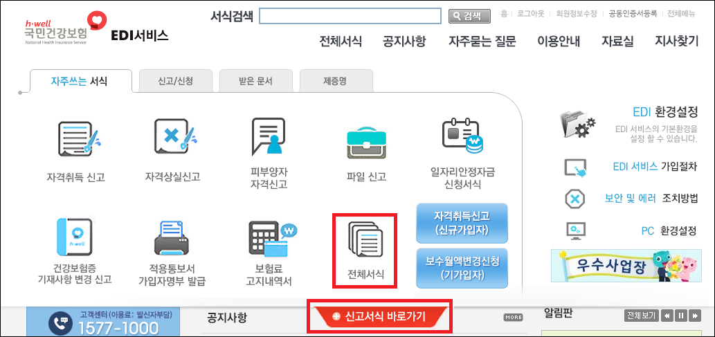 1. 건강보험공단 EDI 접속(https://edi.nhis.or.kr/) → 사업장 로그인 → 신고서식 바로가기 → 전체서식 클릭