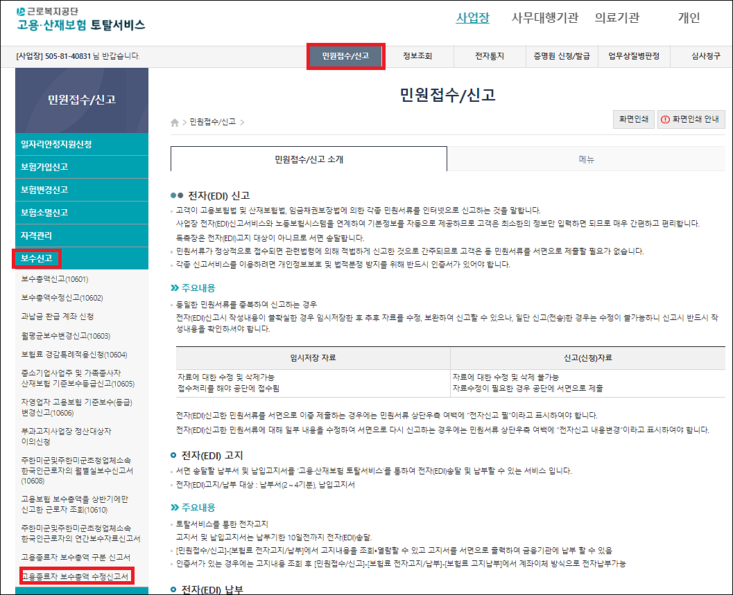 1. 고용산재보험 토탈서비스 접속(근로복지공단 고용·산재보험 토탈서비스 (comwel.or.kr)) → 사업장 로그인 → 민원접수/신고 → 보수신고 → 고용종료자 보수총액 수정신고서 클릭