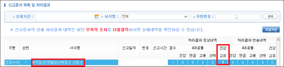 5. 퇴직정산/연말정산재정산 신청서 처리결과 정상내역의 숫자 클릭