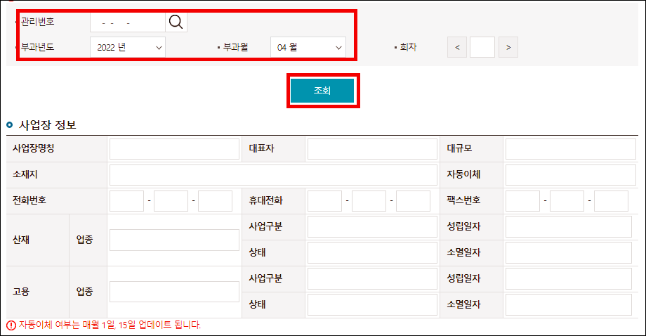 2. 사업장 관리번호 선택 → 부과연월 선택 → 조회