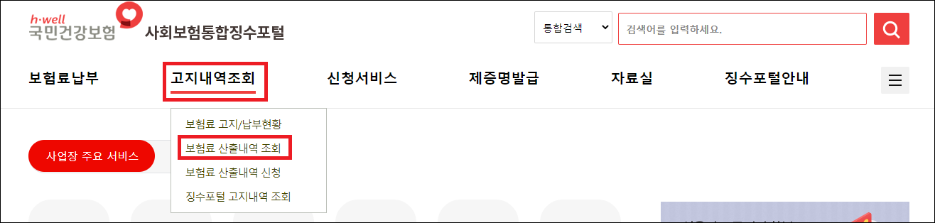 1. 사회보험통합징수포털(https://si4n.nhis.or.kr) 접속 → 사업장 로그인 → 고지내역조회 → 보험료 산출내역 조회 클릭
