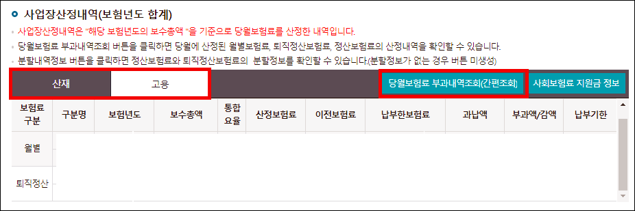3. 고용 또는 산재 선택 → 당월보험료 부과내역조회(간편조회) 클릭