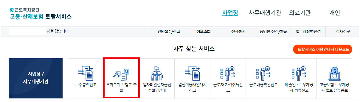 1. 고용·산재보험 토탈서비스(https://total.comwel.or.kr) 접속 → 사업장 로그인 → 부과고지 보험료 조회 클릭