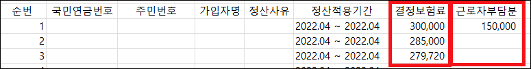 국민연금 고지내역 파일을 다운로드하시면 가입자별 결정보험료가 우측에 표시됩니다. 이때 결정보험료는 사업자 부담분을 합한 금액이므로 근로자 부담분은 결정보험료의 1/2 금액이 됩니다. 맨 우측의 근로자부담분은 제가 만든 열로, 결정보험료의 1/2을 계산해서 넣은 금액입니다. 국민연금 고지내역 파일에는 해당 열이 없으니 실무자분들은 결정보험료의 1/2 수식을 우측에 넣어주시고 급여에서 공제하실 때 결정보험료가 아닌 근로자 부담분만큼을 공제하여 주시면 됩니다.