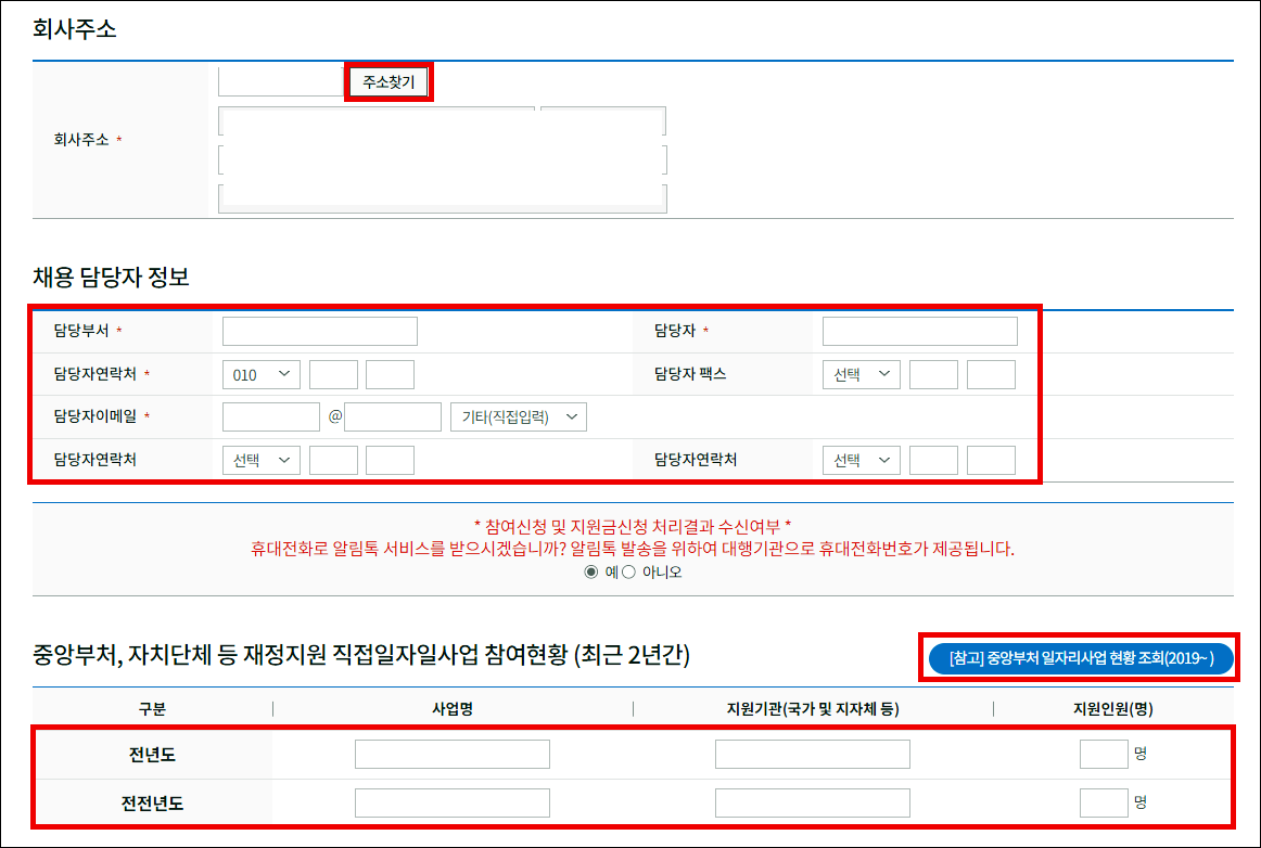 3. 회사주소, 채용담당자 정보, 재정지원 직접일자리사업 참여 현황 입력