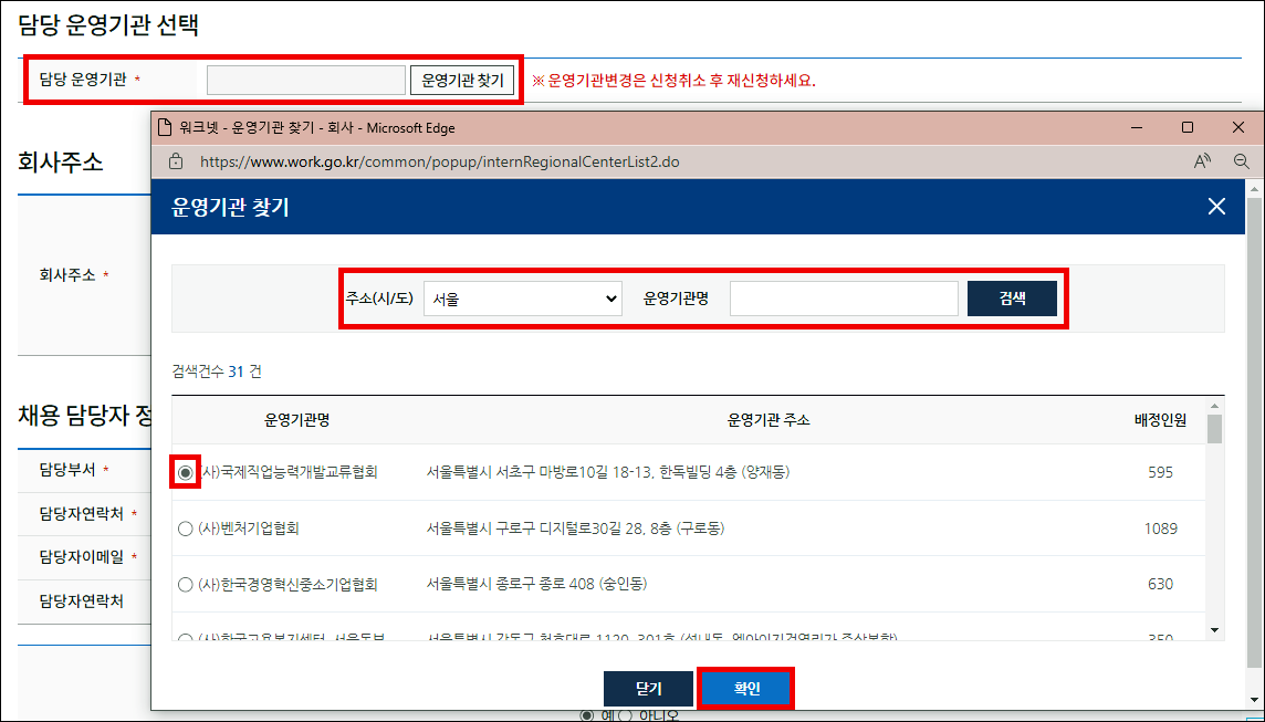 - 소재지의 운영기관 중 한 곳을 선택한 후 확인 버튼을 클릭합니다.