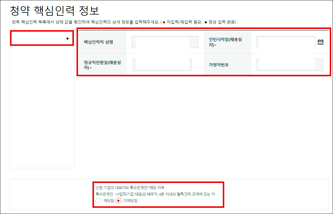 - 좌측에는 청년내일채움공제 대상 근로자의 성명이 기재되어 있고 해당 이름을 클릭하시면 근로자 정보고 입력되어 있습니다. 입력사항을 확인하신 후 하단의 특수관계인 해당여부를 선택하여 줍니다.