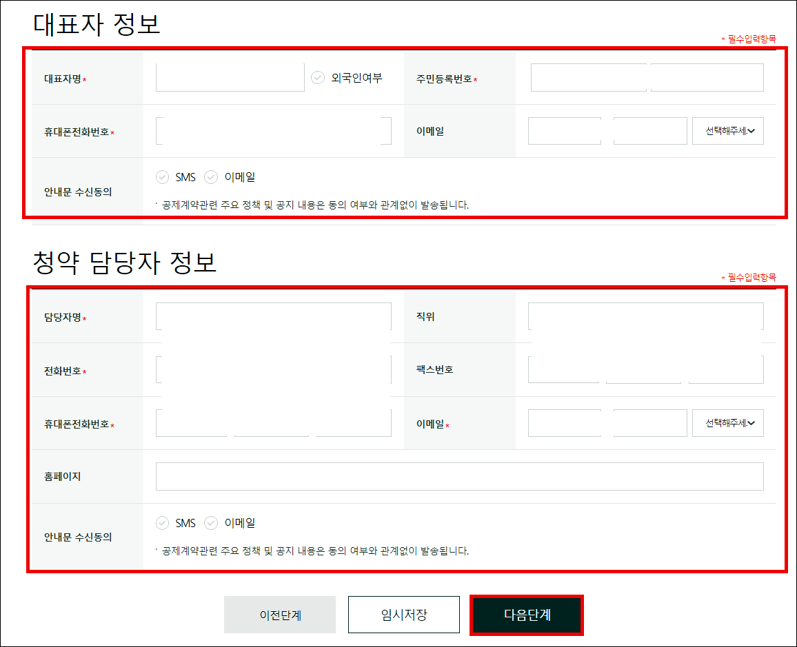 - 대표자와 실무담당자 정보를 입력 후 다음 단계를 클릭하여 줍니다.