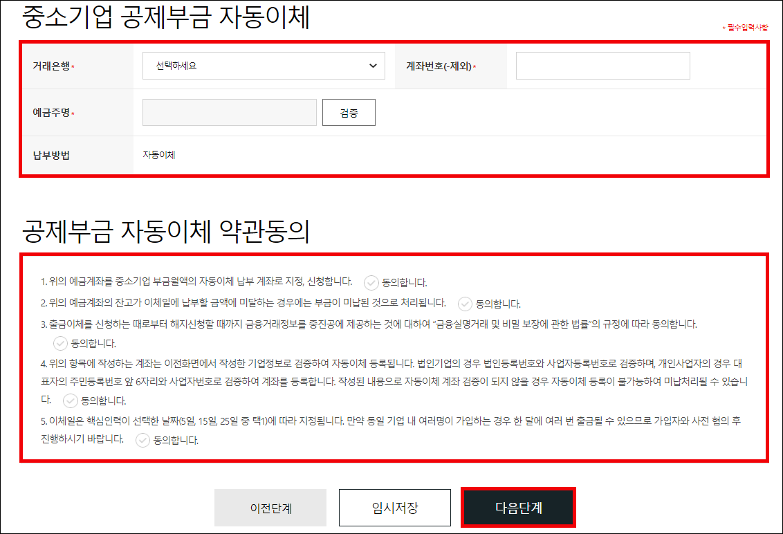 7. 기업부담금 자동이체 계좌 입력 및 약관 동의