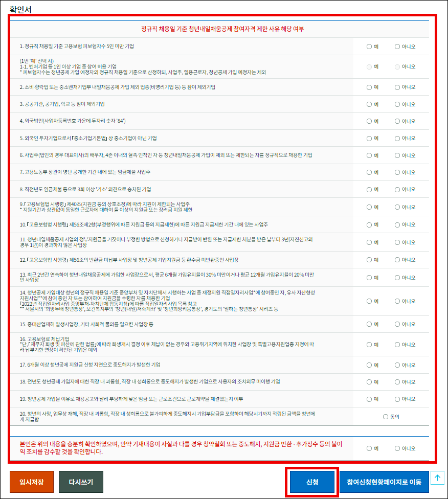 - 청년내일채움공제 참여자격 제한 사유 해당여부를 확인하신 후 예, 아니오를 선택하여 줍니다. 해당 내용을 거짓으로 기재할 경우 지원금 반환뿐 아니라 추가징수 등의 불이익이 있으니 정확하게 입력하여 줍니다.