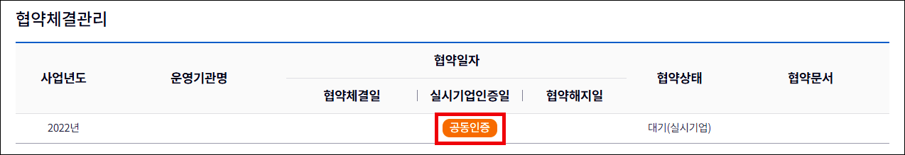 - 공동인증서로 협약체결을 완료하시면 협약상태가 대기에서 협약체결로 변경됩니다.