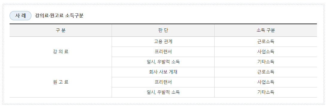- 즉, 같은 강연을 하여도 프리랜서로 반복적으로 강연을 하여 소득을 얻는 사람의 경우 해당 소득은 사업소득이 되고, 일시적으로 강연을 하게 된 경우에는 기타소득이 됩니다.