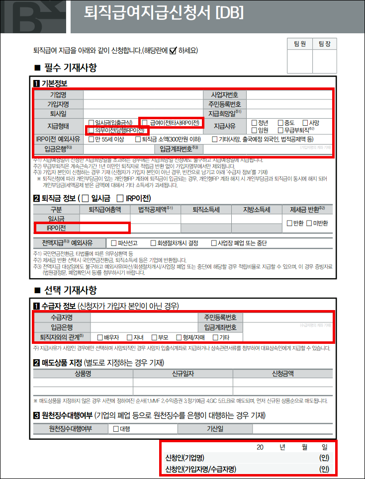 - 입금은행과 입금계좌번호는 반드시 ★근로자의 IRP계좌 은행과 계좌번호★를 기재하여 줍니다.