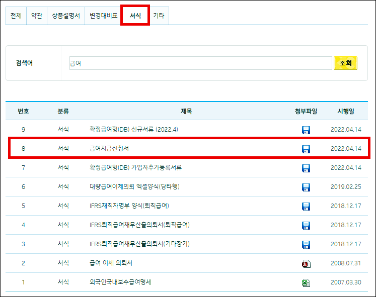 3. 서식 탭 → 검색어 '급여'로 조회 → 급여지급신청서 다운로드
