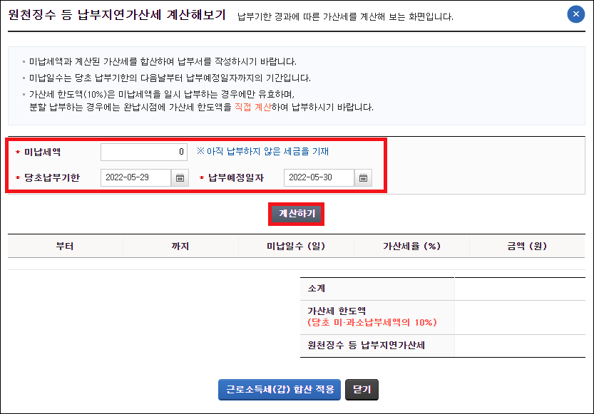 - 미납세액과 당초 법정납부기한, 납부예정일자를 입력하신 후 계산하기 버튼을 눌러 가산세를 확인합니다.
