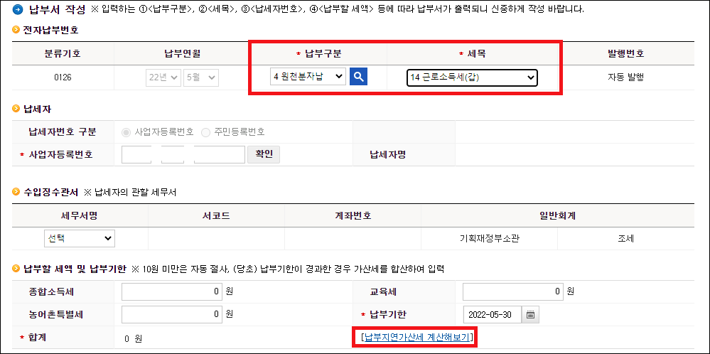 2. 납부구분 및 세목 선택 → 납부지연가산세 계산해보기 클릭